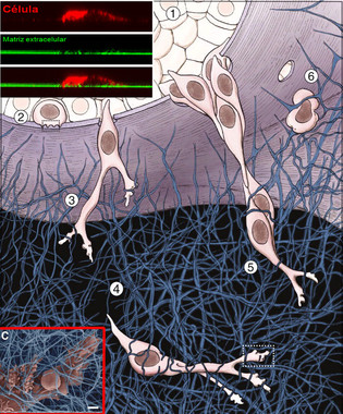 Esquema del proceso de invasión tumoral. Las células tumorales (1) comienzan a degradar mediante los invadosomas (taladrosquímicos ) la primera barrera que limita su movimiento (2). En la parte superior izquierda se muestra una imagen microscópica de estos taladros en una célula(rojo) que perforan y destruyen la barrera que forma la matriz extracelular sobre la que se encuentran (verde). Una vez realizada la perforación, las células atraviesan la barrera y acceden a un nuevo espacio repleto de fibras que dificultan su desplazamiento. Para desplazarse a través de esta intrincada redlas células cambian su forma y tamaño (3 y 4), lo que permite que otras células les sigan (5), o de forma individual mediante movimientos ameboides (6). En la parte inferior izquierda se muestran Imágenes microscópicas de células dentro de la matriz de colágeno. / UPF