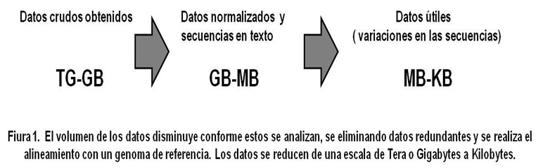 Se estima que el costo de almacenar los gigabytes de los datos crudos producidos por una corrida de secuenciación es muchas veces mayor al costo per se de la generación de los datos, Una vez analizados los datos crudos, la información útil se reduce considerablemente (Figura 2), por lo que muchos investigadores tienen ahora la tendencia a eliminar todos los archivos crudos, una vez que éstos han sido analizados (Batley, J., 2009).