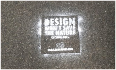 Caminando por la ciudad de Berlín encontré este stencil impreso en el pavimento. «Design won’t save the nature». A pesar de saber que se trata de un reclamo publicitario de una emergente marca de bicicletas, nunca estuve más en desacuerdo con una frase.