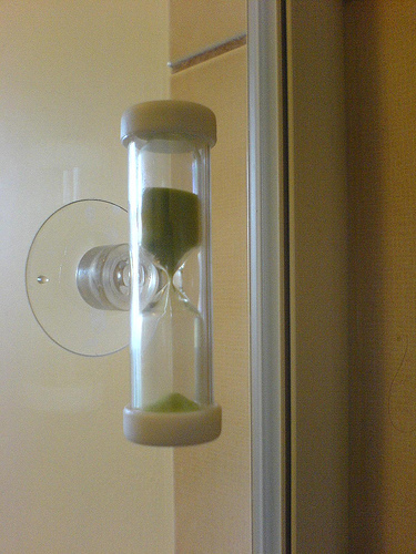 Hace algunas semanas una empresa dedicada a la construcción me regaló un reloj de arena pequeño que se puede pegar en el azulejo del baño. Lo giras para que cuente exactamente 5 minutos. Nunca me había puesto a contar el tiempo que estoy bajo la regadera hasta que hice el ejercicio y rutina de ver al reloj.