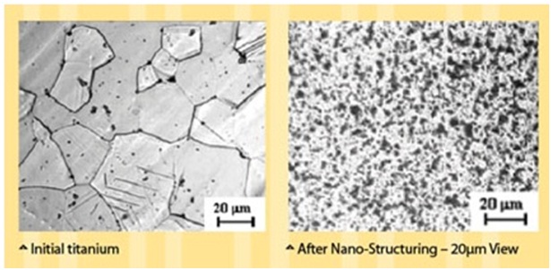 Gracias al advenimiento de los metales nanoestructurados, se generan configuaraciones de granos ultrafinos (ver figura en donde compara el número de granos incluidos en 20 micras) en donde la interacción entre los tejidos y el metal puede llevarse a cabo en cualquier superficie o en el cuerpo mismo del implante sin necesidad de tratamientos superficiales especiales. Los investigadores han evaluado el crecimiento de fibroblastos, pre osteoblastos y células madre en titanio nanoestructurado, encontrando un incremento en la adhesión y proliferación de las células en un factor de veinte.