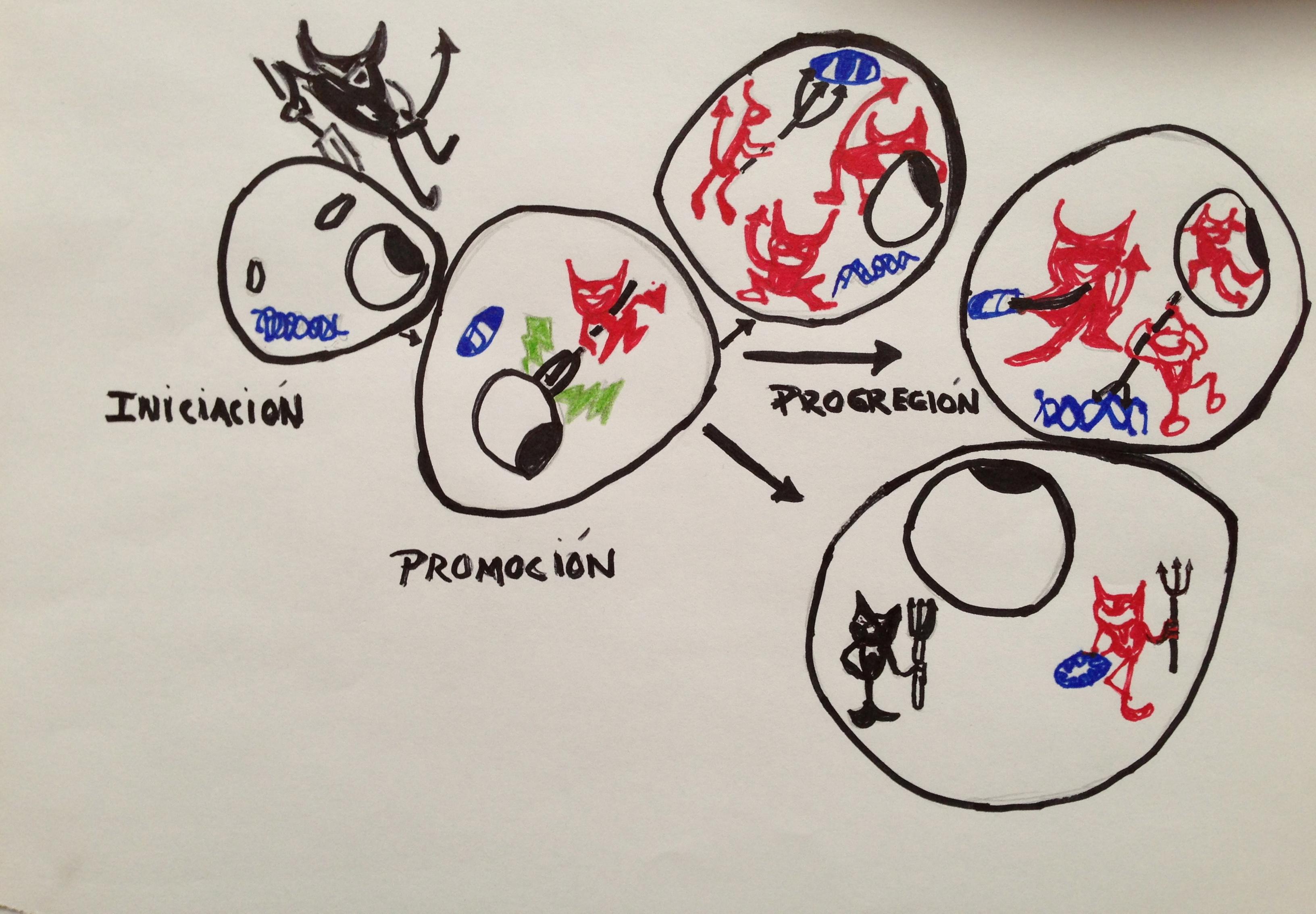 El cáncer comienza en una sola célula. La transformación de una célula normal en tumoral es un proceso de tres etapas para que se llegue a desarrollar el cáncer; este proceso, llamado carcinogénesis, es resultado de la interacción de los factores genéticos de la persona y agentes externos (Figura 1).