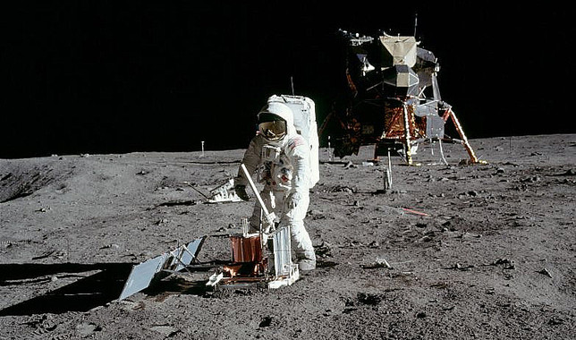 El astronauta Buzz Aldrin colocó un sismógrafo en el Mar de la Tranquilidad de la Luna cuando llegó con Neil Armstrong. Al fondo, el módulo Eagle de la misión Apolo 11. – NASA