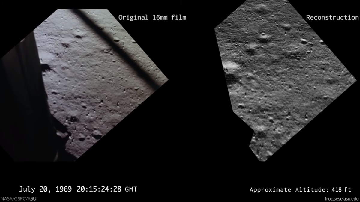 The only visual record of the historic Apollo 11 landing is from a 16mm time-lapse (6 frames per second) movie camera mounted in Buzz Aldrin’s window (right side of Lunar Module Eagle or LM). Due to the small size of the LM windows and the angle at which the movie camera was mounted, what mission commander Neil Armstrong saw as he flew and landed the LM was not recorded. The LROC team reconstructed the last three minutes of the landing trajectory (latitude, longitude, orientation, velocity, altitude) using landmark navigation and altitude call outs from the voice recording.