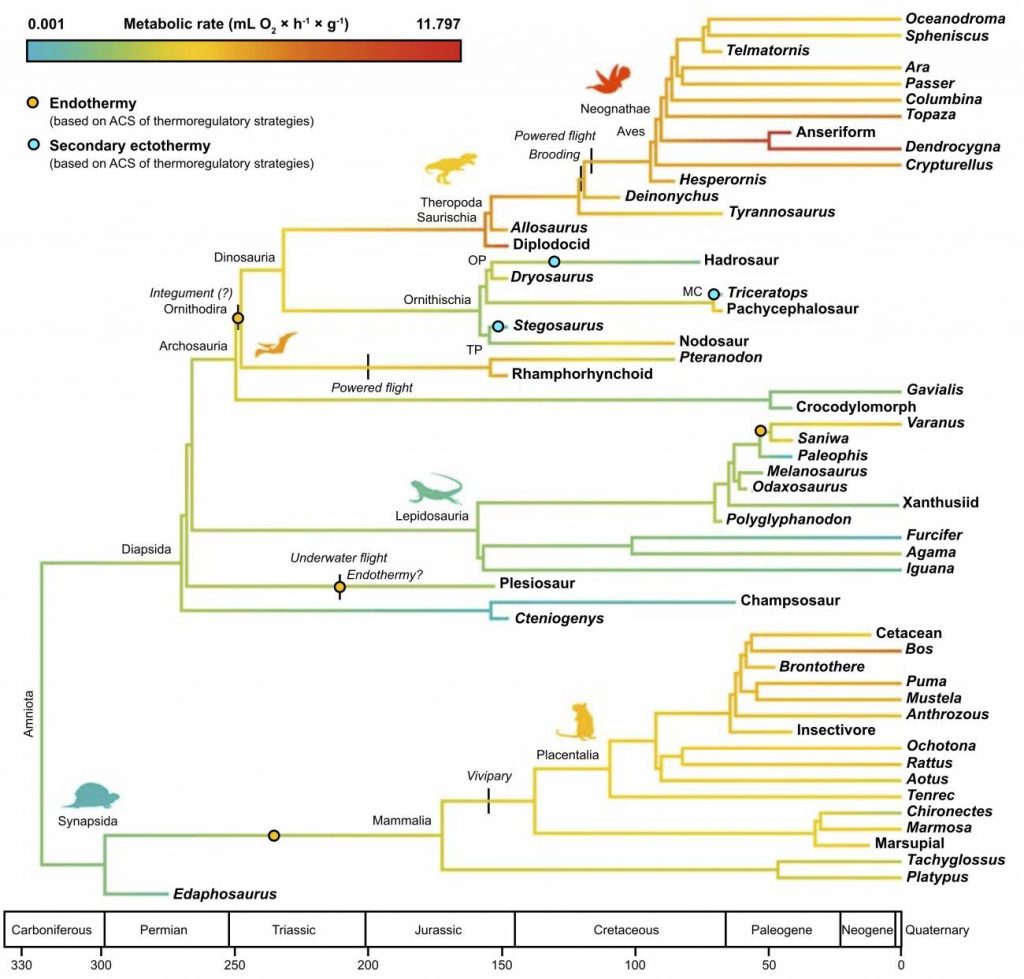 Filogenia de consenso calibrada en el tiempo de amniotas fósiles y modernos que muestra la evolución 393 de tasas metabólicas y estrategias térmicas